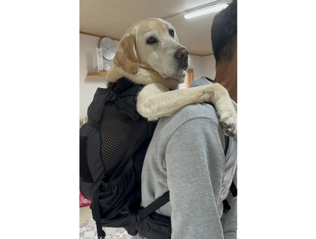 災害時やレジャーの際に怪我を追った時など、大型犬が歩けない状態になった時、ワンちゃんを抱えての移動はやはりおんぶが最も人間にとっても犬にとっても負担が少ない移動手段だと感じます。