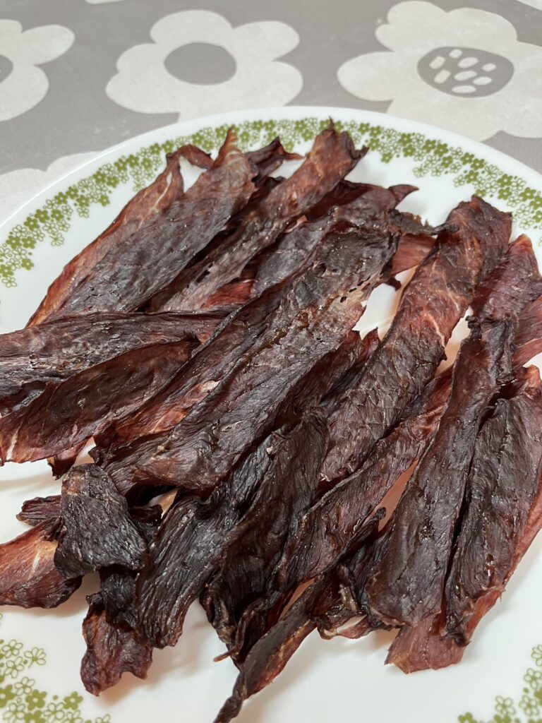 運動量の多い日に脂の少ないヒレやモモ肉のビーフジャーキーを与えるのが良いと思います。